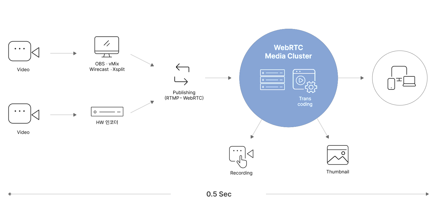 단독구성 및 클러스터 구성을 통해 안정적인 실시간 저지연 방송을 할 수 있습니다.